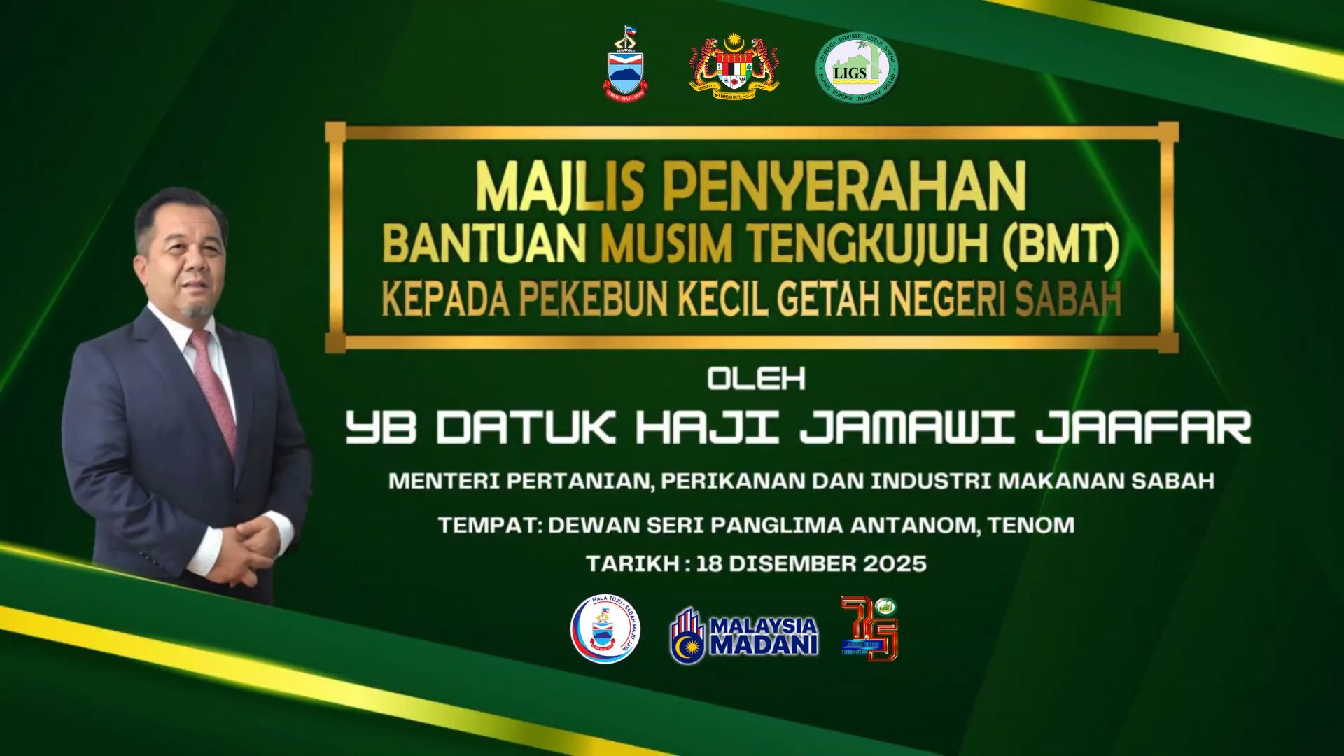 Tenom, 18 Disember 2025 - Lembaga Industri Getah Sabah (LIGS) telah menganjurkan Majlis Penyerahan Bantuan Musim Tengkujuh (BMT) kepada pekebun kecil getah Negeri Sabah bertempat di Dewan Seri Panglima Antanom, Tenom.